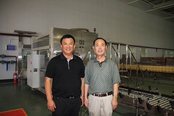 时任山东省农业厅厅长战树毅与威龙总经理孙砚田在威龙全自动灌装生产线前合影